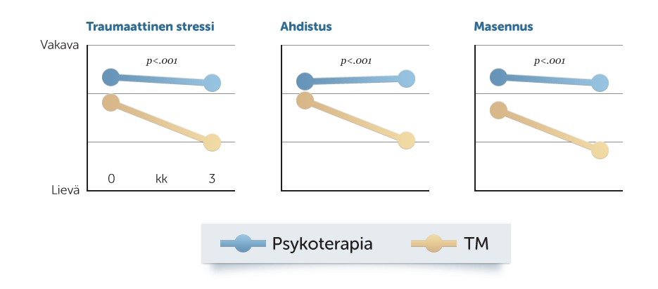 Tuoreessa tutkimuksessa Yhdysvaltain Irakin-sodan veteraaneilla havaittiin traumanjälkeisten stressioireiden ja masennuksen vähentymistä puoleen aiemmasta vain 8 viikon TM-harjoituksen jälkeen.LähdeRosenthal J, et al. Effects of transcendental meditation (TM) in veterans of Operation Enduring Freedom (OEF) and Operation Iraqi Freedom (OIF) with post-traumatic stress disorder (PTSD): a pilot study. Military Medicine 176: 626-630 (2011). Tulokset olivat niin vakuuttavia, että CNN-kanava esitti siitä ohjelman Yhdysvaltain veteraanipäivänä. (Katso CNN:n video.)